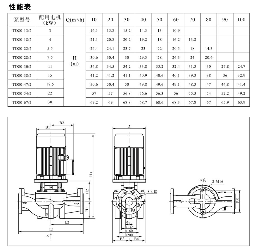 TD80系列單級管道離心泵,配有標準電 機和機械密封。此類產品的結構與相近類型產品相比,更不易受到泵送液體中雜質的影響。產品設計為頂部可拉出的拆裝形式,其可 以在不影響管路系統的情況下對泵進行維修。所有泵采用創新式便拆式機械密封,更好機械密封無需拆卸電機。